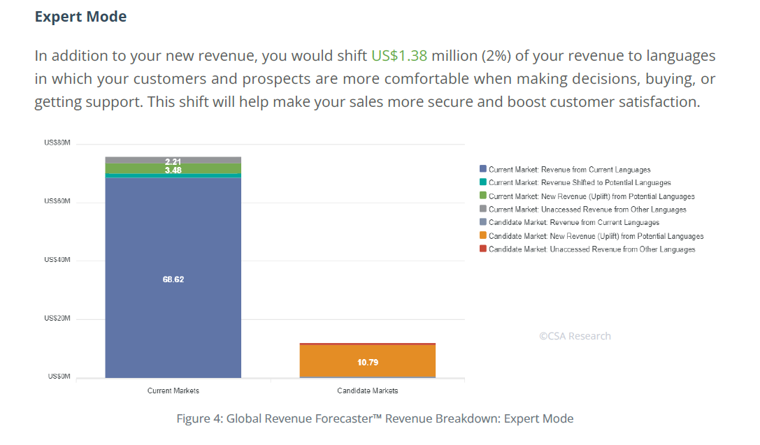 The Global Revenue Forecaster™ delivers predictive business analytics tailored to your company’s business and verticals to estimate potential revenue from additional languages.